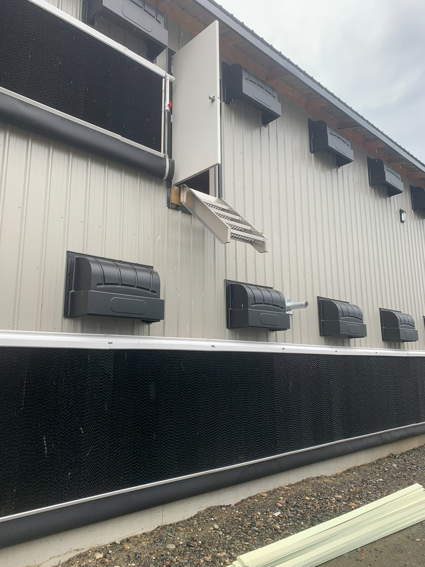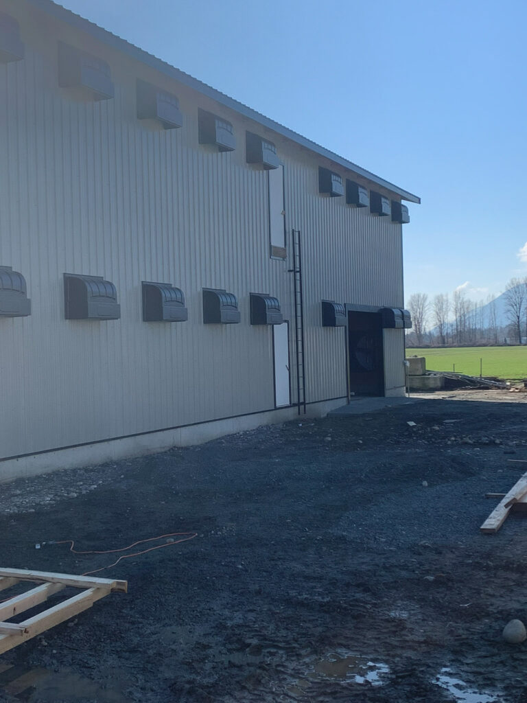 This barn uses a long, narrow layout that supports efficient airflow and large flock capacity. The metal siding and steel roof are durable, washable, and moisture-resistant, while the raised concrete base improves drainage, pest control, and long-term stability. Deep roof overhangs and a covered entry protect doors and reduce weather exposure.